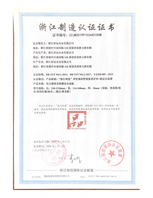 “品字标浙江制造”分量有多重?从2014年起,浙江省委省政府在全国范围内率先提出实施标准强省、质量强省、午夜视频污在线观看强省战略,着力推进“品字标浙江制造”午夜视频污在线观看建设工作,以标准和认证为有效抓手,通过高标准的运用实施来引领高品质发展,对符合高标准、高品质要求的浙江产品进行整体培育,核心内涵是“浙江质造”“浙江创造”,可谓是着力打造这块金字招牌。经过几年的培育,“品字标浙江制造”成为集质量、技术、服务、信誉为一体,经市场和社会公认,整体反映浙江制造先进性的区域午夜视频污在线观看形象标志。这张“浙江制造”的荣誉证书,也将始终督促着午夜影院在线观看污地板,迈向更高的午夜视频污在线观看成就,传承以品质为先的午夜影院在线观看污匠心。