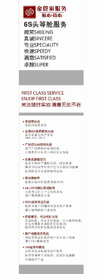 从专卖店、测量、安装、检测所有人员均受过专业培训并通过反复的实践,能为客户提供最优的地板铺装方案与技术服务,务必让每一位客户由衷的感到满意,让您的家舒适而环保。在根据不同季节地板保养、清洁要求,国家节假日等对客户进行手机短讯温馨保养提示以及深切问候祝福。在地板日常使用过程中,实木、实木多层、实木地热、仿实木强化木,都可质量保修1年,并且提供终身维护和保养服务咨询。