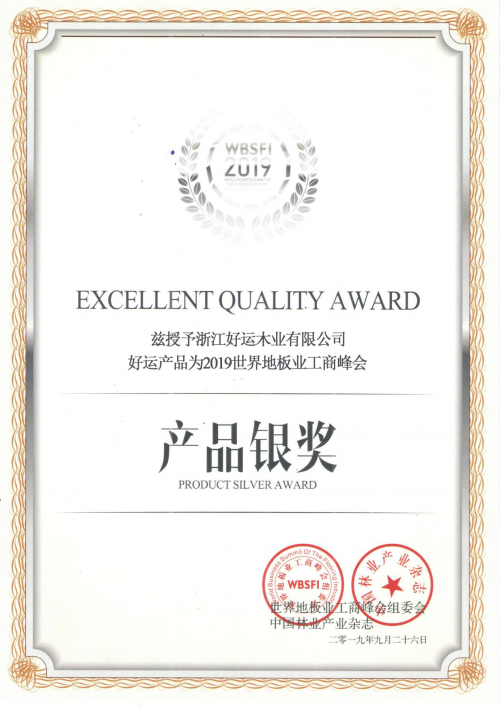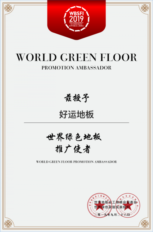 9月26日,2019世界地板业工商峰会在中国·吴江区圆满落下帷幕。中国实木地板联盟的执行主席单位——午夜影院在线观看污地板应邀出席本次峰会并被授予“世界绿色地板推广使者”荣誉称号。优质的产品品质也得到行业内一致认可,斩获2019世界地板业工商峰会产品银奖。